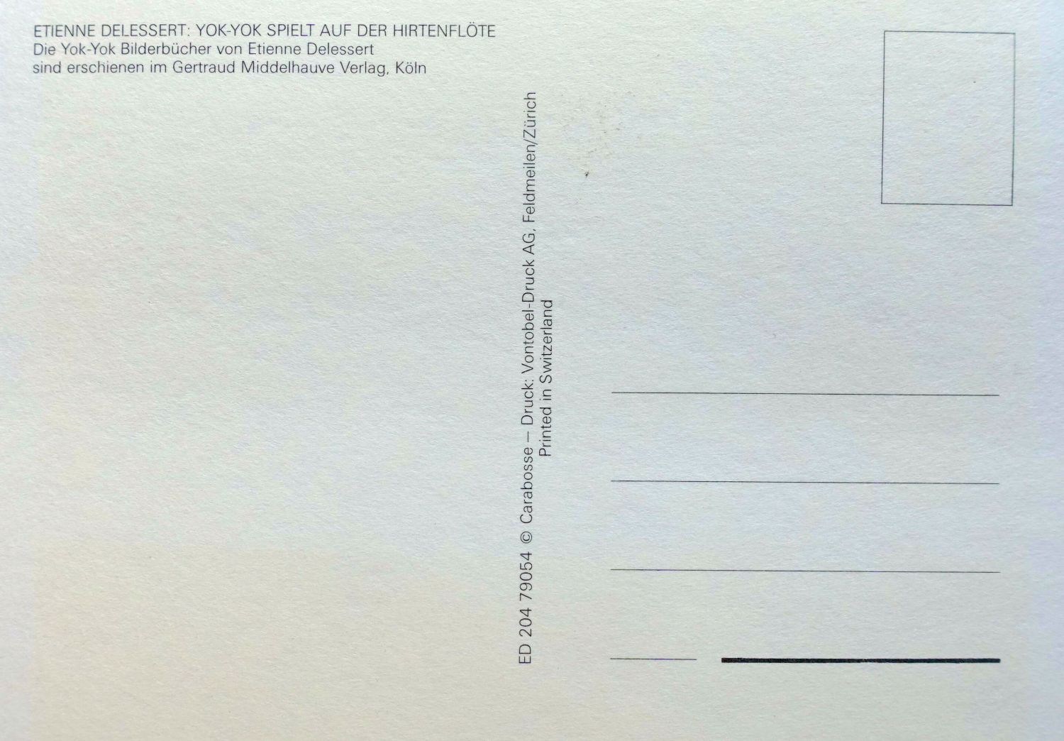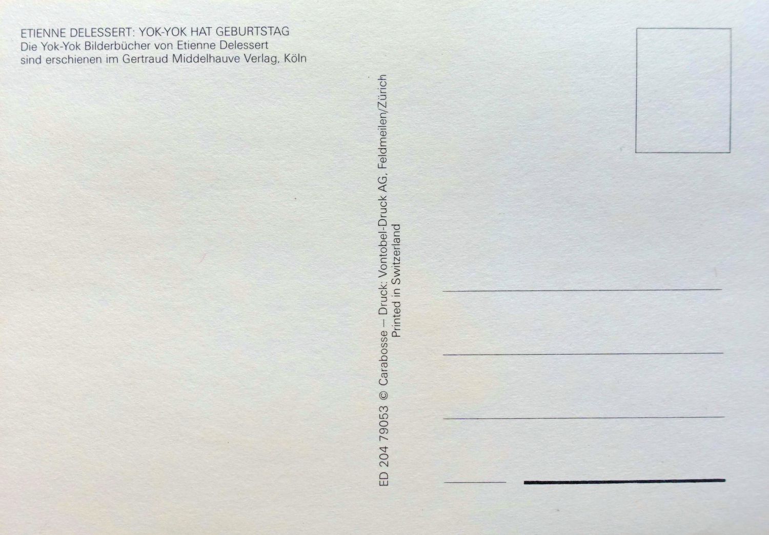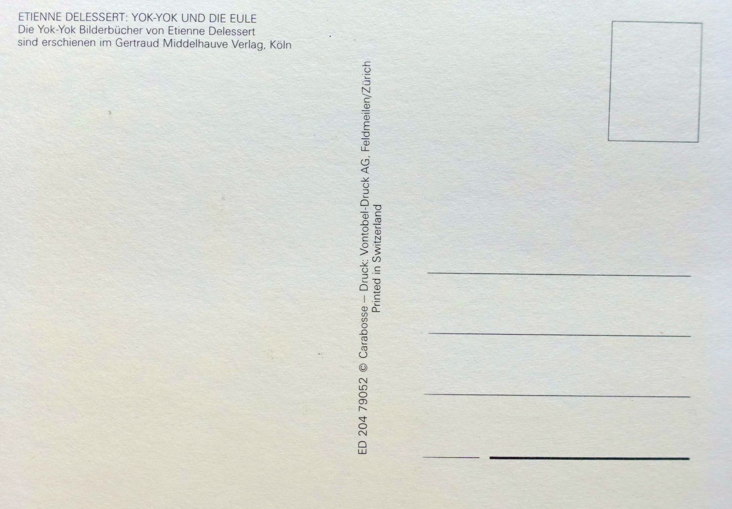 Etienne Delessert erschuf die ikonische Figur Yok-Yok gemeinsam mit Anne van der Essen. Im Gertraud Middelhauve Verlag erschienen zwischen 1979 und 1980 zwölf quadratische Bilderbücher mit je vier Bildergeschichten. Die Verse der ersten sechs Bände sind von Franz Hohler, die Verse von Band 7 bis 12 von Ludwig Askenazy.