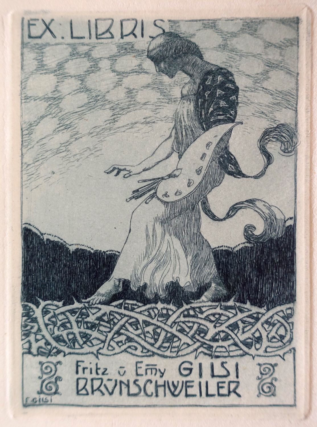 Kurz-Biographie: Der in Zürich geborene Fritz Gilsi wuchs in Paris auf. Dort leitete sein Vater ein Atelier für Chromolithografie. Nach seiner Schulzeit besuchte Gilsi Kurse an der Zeichnungsschule Bernard Palissy in Paris. 1895 kehrte er in die Schweiz zurück und begann ein Kunststudium an der Zürcher Kunstgewerbeschule. Er studierte zusammen mit Augusto Giacometti (1877–1947). 1897 erweiterte er seine Ausbildung in St. Gallen zum Textilentwerfer und trat dann in Paris eine Stelle als Industriezeichner für Stoffe und Tapeten an. Ab 1904 lebte er wieder in St. Gallen und arbeitete als Stickereizeichner, freischaffender Künstler und als Lehrer an der Gewerbeschule St. Gallen.