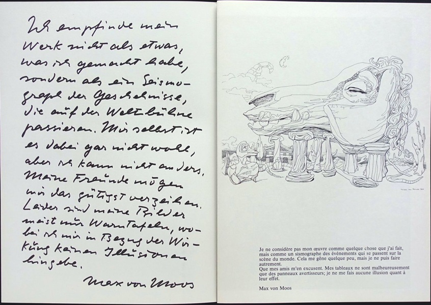 Diese Monographie von Peter Thali ist ein Wendepunkt in der Wahrnehmung des Werks von Max von Moos. Vor 1974 gab es bereits wohlwollende Kritiken und Solo-Ausstellungen, doch erst dieses grosse und in zeitloser Schlichtheit gestaltete Buch verschaffte Max von Moos in einer breiteren Öffentlichkeit die verdiente Aufmerksamkeit. Unter Enthusiasten nur "Thali" genannt.